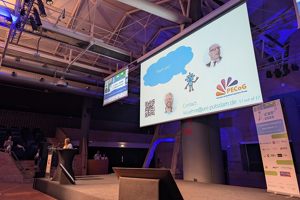 At the last day of the ICSR on September 12, 2025, Katharina Kühne presented her full paper titled “Small Talk with a Robot Reduces Stress and Improves Mood” (written together with Antonia L. Z. Klöffel, Oliver Bendel, and Martin H. Fischer). Previous research has shown that social support reduces stress and improves mood. This study tested whether small talk with a social robot could be helpful. After performing a stressful task, 98 participants either chatted with a NAO robot, listened to the robot tell a neutral story, or did not interact with the robot. Both robot interactions reduced stress – particularly small talk, which also boosted positive mood. The effects were stronger in participants with high acute stress. Positive affect played a key role in stress reduction, suggesting that robot-mediated small talk may be a useful tool for providing emotional support. Dr. Katharina Kühne and Prof. Dr. Martin H. Fischer are researchers at the University of Potsdam. Antonia L. Z. Klöffel assists Katharina Kühne as a junior scientist. Martin Fischer is the head of the Potsdam Embodied Cognition Group (PECoG). Prof. Dr. Oliver Bendel is an associated researcher with PECoG.